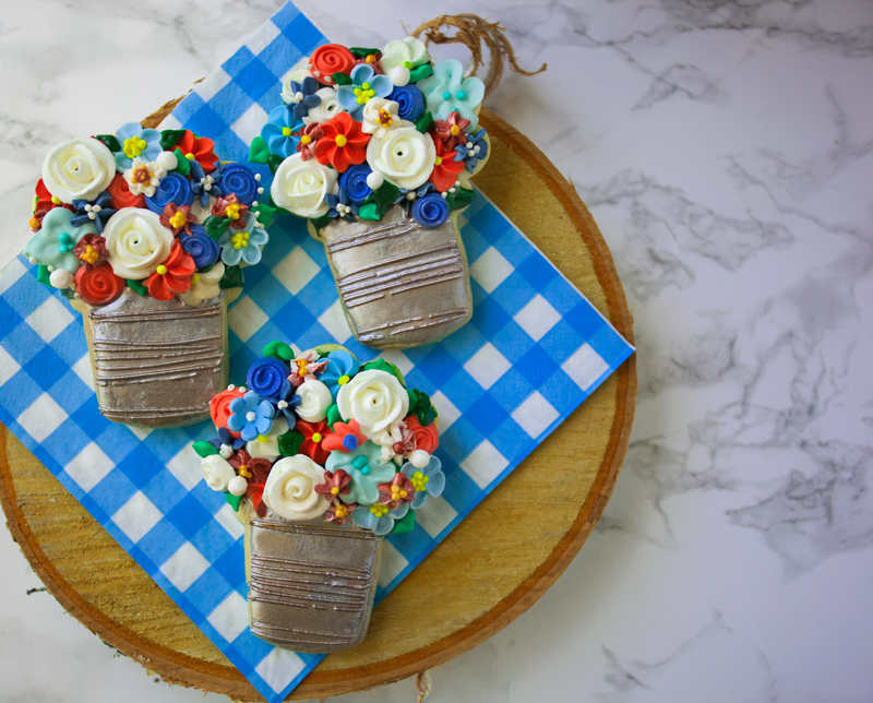 I started out by spreading thicker green icing. Then I started placing the flowers on. I placed the larger flowers first, then filled in with smaller ones. To make it look like smaller flowers are behind the larger, I broke the smaller flowers in half and nestled them in next to the larger. To build more dimension, I placed flowers on top of other flowers. I flooded the tin can portion white and piped the lines on. Once it was dry, I used bronze and silver to paint the can.